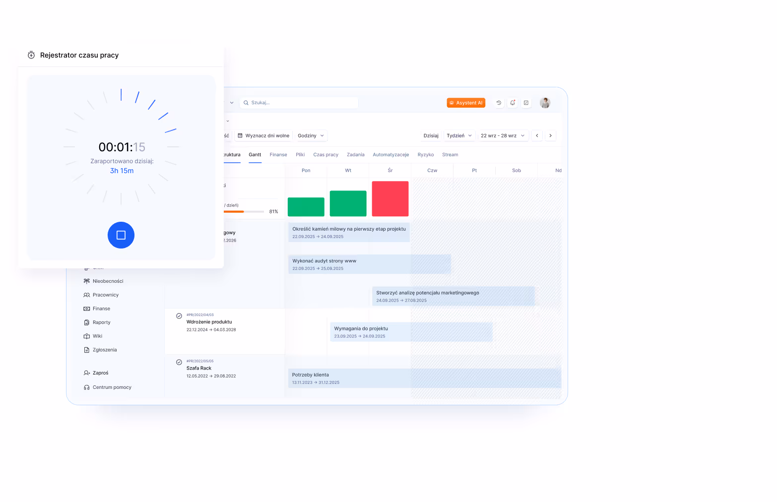 It supports you every step of the way — it analyzes the working time reports, indicates areas of overload and suggests possible optimizations. The assistant works in the background, constantly analyzing the data to suggest optimal solutions.