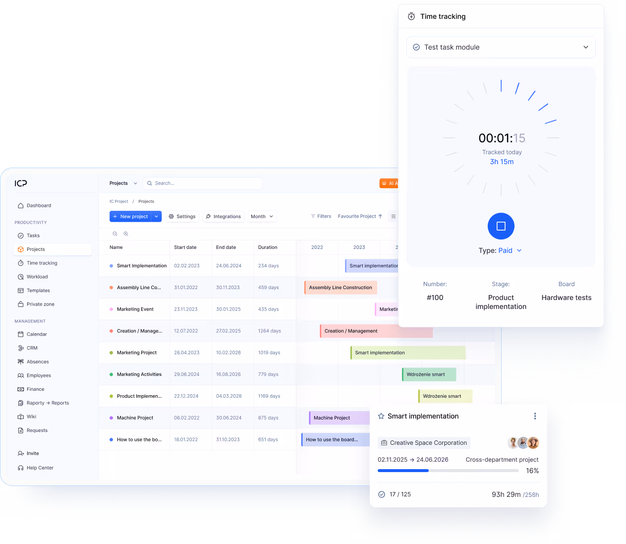Everything in IC Project works in a single ecosystem — you plan tasks, run projects, communicate with your team, and measure uptime right away. This gives you a complete context, without the need for several tools.