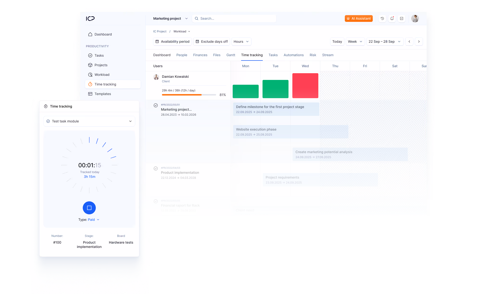 In IC Project, you can use the recorder in real time or report the time manually. Both solutions complement each other perfectly, allowing you to adapt the process to your company's work style.