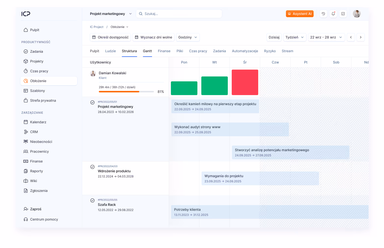 In IC Project, you have access to clear occupancy charts that show the availability of each employee. Colored indicators help to instantly recognize who is overloaded and who has free powers.