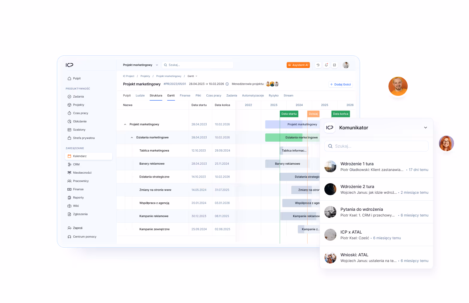 IC Project łączy codzienną komunikację, zadania i projekty, dzięki czemu każdy proces jest spójny i przejrzysty. Zespoły pracują według tego samego schematu, a wyniki są natychmiast widoczne.